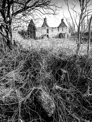 Taken near Craigie Farm. Liam converted this picture to black and white, enhancing the aging aspect. The derelict house is framed by the trees, and the grasses in the foreground work well.