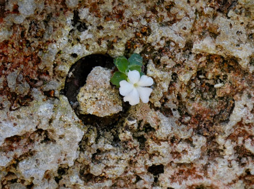 A tiny primula in the tufa wall of the Alpine House, Botanics