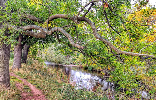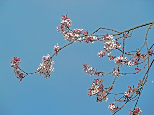 Taken at an unusual angle, this is a lovely juxtaposition of daffodils and trees