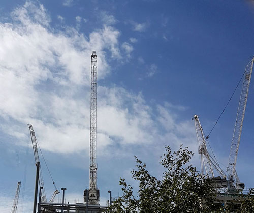 Sonia chose her own picture of cranes in Edinburgh. The picture has plenty of space with an interesting sky as background and framed by foliage in the foreground. The cranes are nicely distributed across the picture.