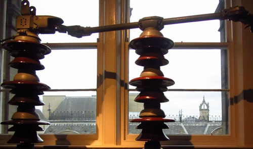 Marjorie chose this picture taken in the Museum during an earlier outing of colourful insulators with an Edinburgh background, including St Giles, which is almost black and white.