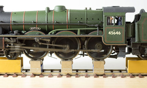 Here are two samples from Carina's set of pictures taken using her rolling road for her model locomotives, showing her Jubilee class engine travelling at about 15 mph. Changing the settings on the camera changes the appearance of the moving parts.