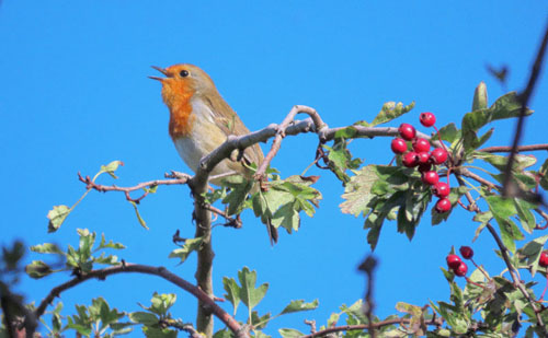 Gillian chose this picture of a robin which Athol tells us was singing happily. A beautiful picture with a bright blue sky, plus red berries.