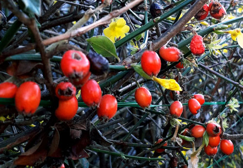 The brightly coloured berries stretching across the frame caught Sonia's eye, with the spring daffodils poking through.