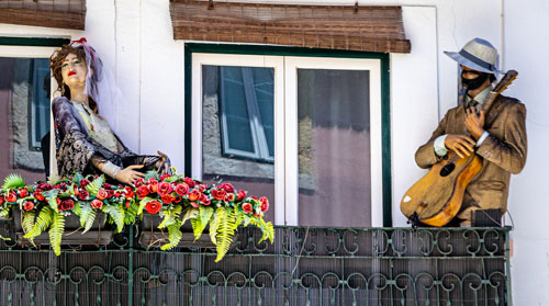 Sandra took these pictures in Lisbon. She liked the combination of the two figures and the flowers, which add colour. Also the reflexions of the windows opposite in the glass.